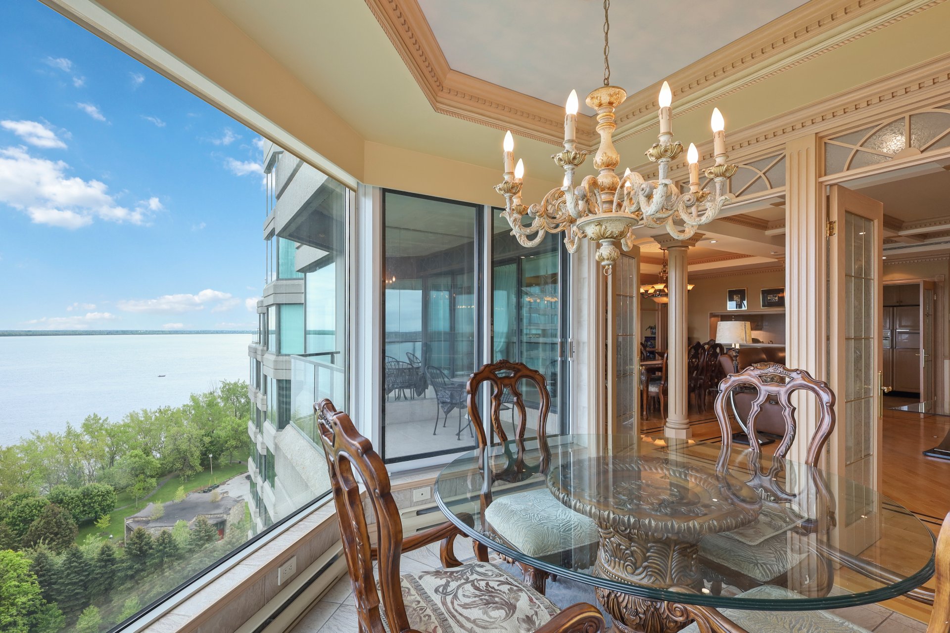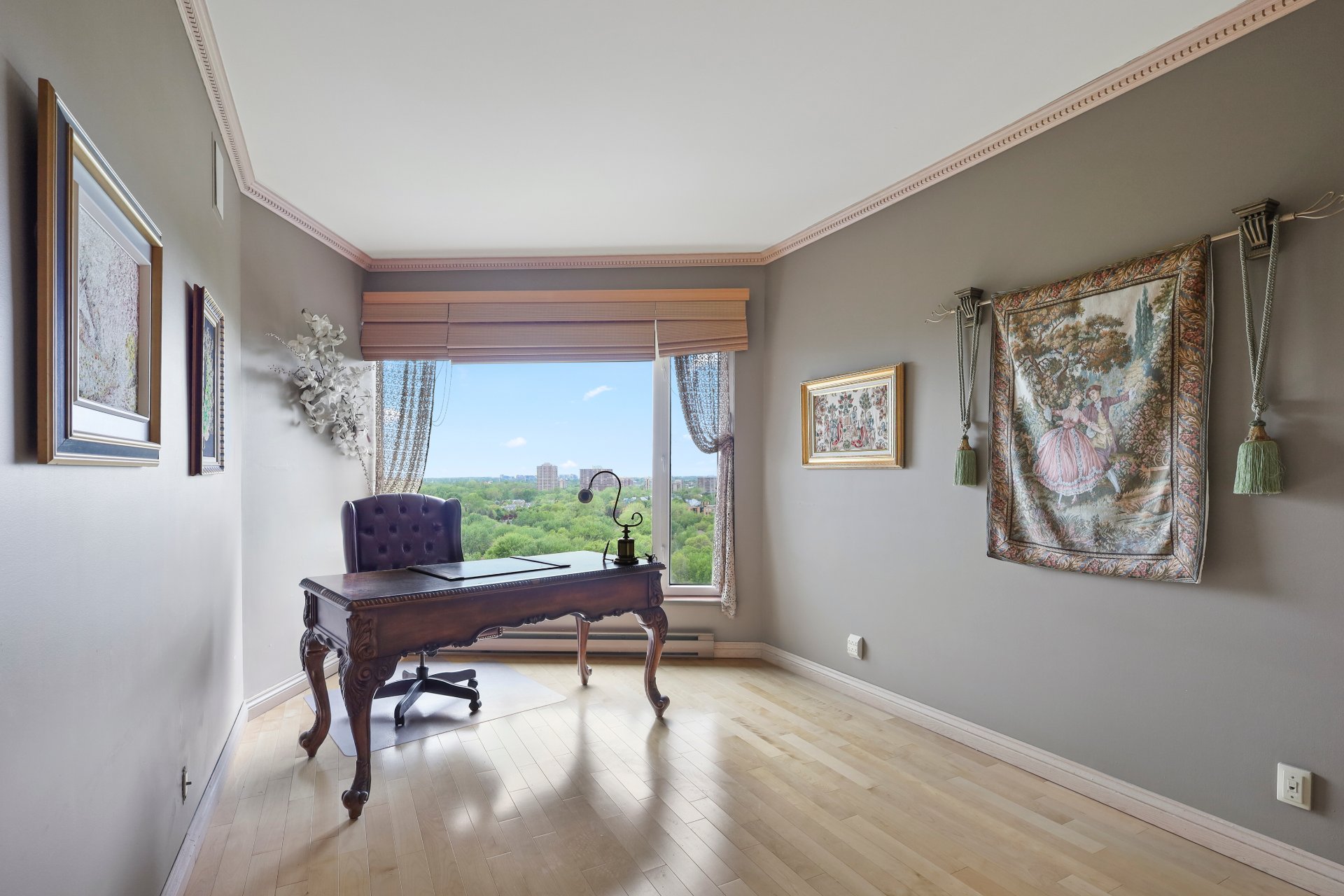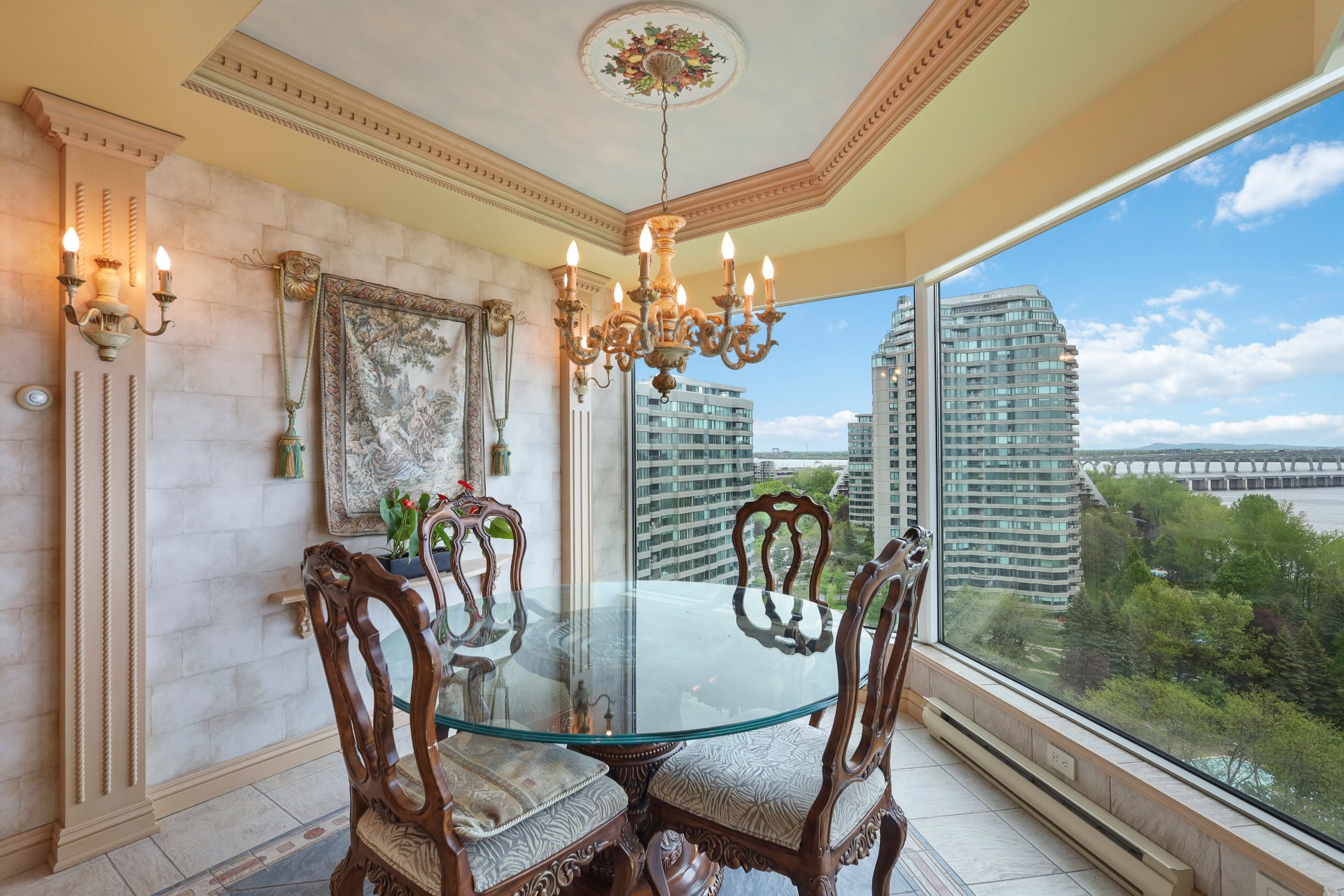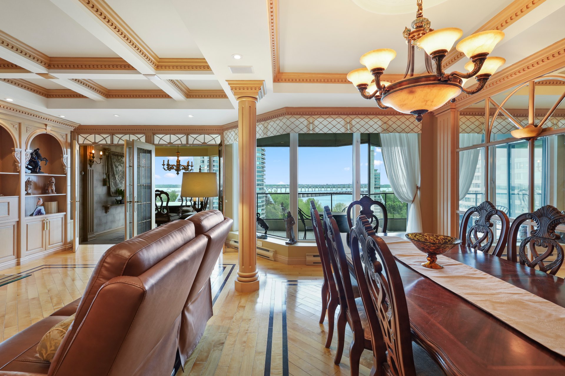 Les Verrières Phase VI : Étonnante unité traversante au 15ieme étage, offrant un décor particulier avec ses plafonds à caisson et ses meubles intégrés au salon, le mur en miroir dans la salle à manger pour un effet de profondeur et un agréable solarium. Les pièces sont de bonne superficie, on y retrouve 2 chambres à coucher ainsi que 2 salles de bain; 2 espaces de stationnement sont également compris. De plus, les prestations de l'immeuble ne sont pas à négliger : piscines intérieure et extérieure, sauna, spa, Salle de sport, gardien de sécurité 24h, salle de squash et de billard, terrains de tennis extérieurs et suites d'invités.