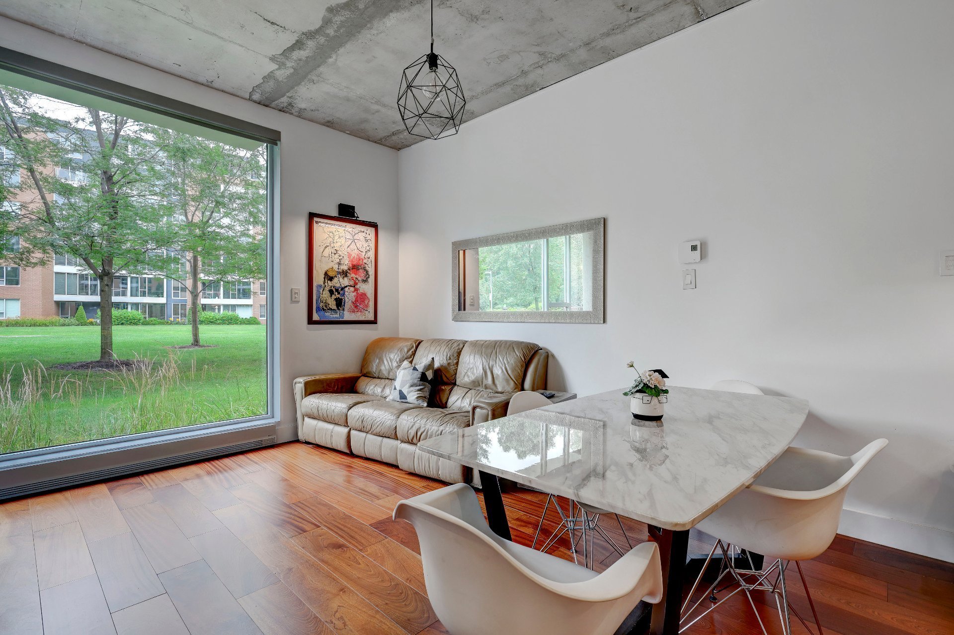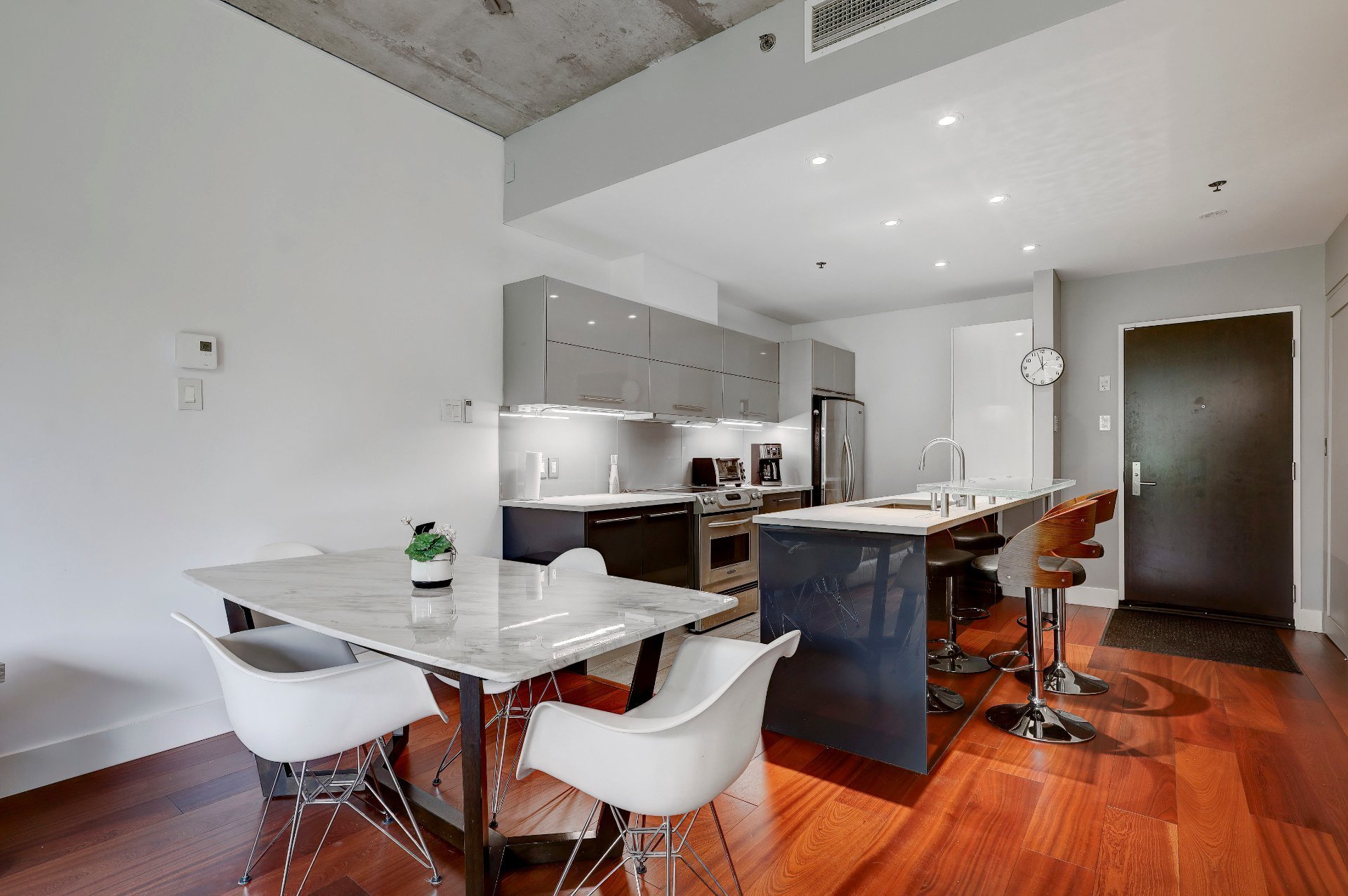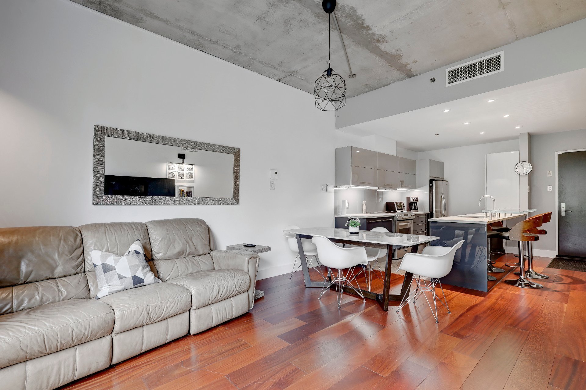 Le salon, la salle à manger et la cuisine sont à aire ouverte. Le plafond de ces pièces (ainsi que des chambres à coucher) est en béton et transforme un espace en lui conférant une allure moderne et sophistiquée, en plus d'avoir une hauteur de 10 pieds. La texture brute et la couleur neutre ajoutent du caractère tout en restant polyvalent. Il est combiné avec des fenêtres pleine hauteur, le contraste entre le béton et la lumière naturelle crée une ambiance à la fois élégante et dynamique. La lumière accentue la texture du béton, soulignant ses nuances et ses imperfections naturelles, tout en adoucissant l'espace avec sa chaleur. Ce mélange de matériaux et de lumière permet de jouer avec les perceptions de l'espace, offrant une esthétique contemporaine qui reste accueillante et vivante. C'est une approche particulièrement efficace dans les espaces ouverts où l'on souhaite équilibrer modernité et confort.