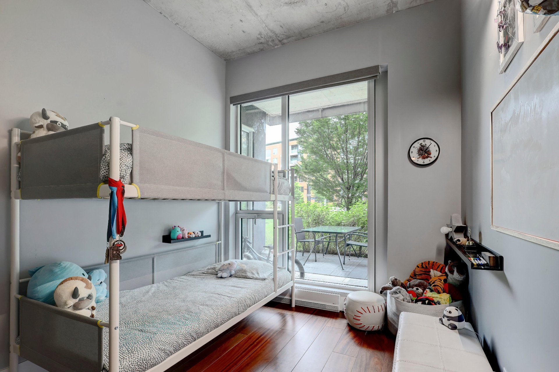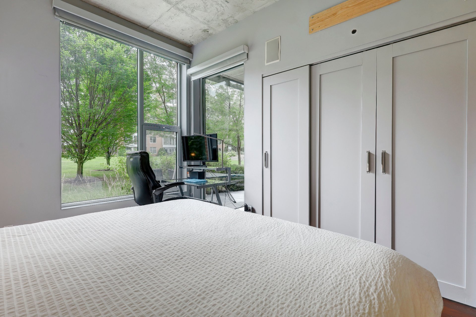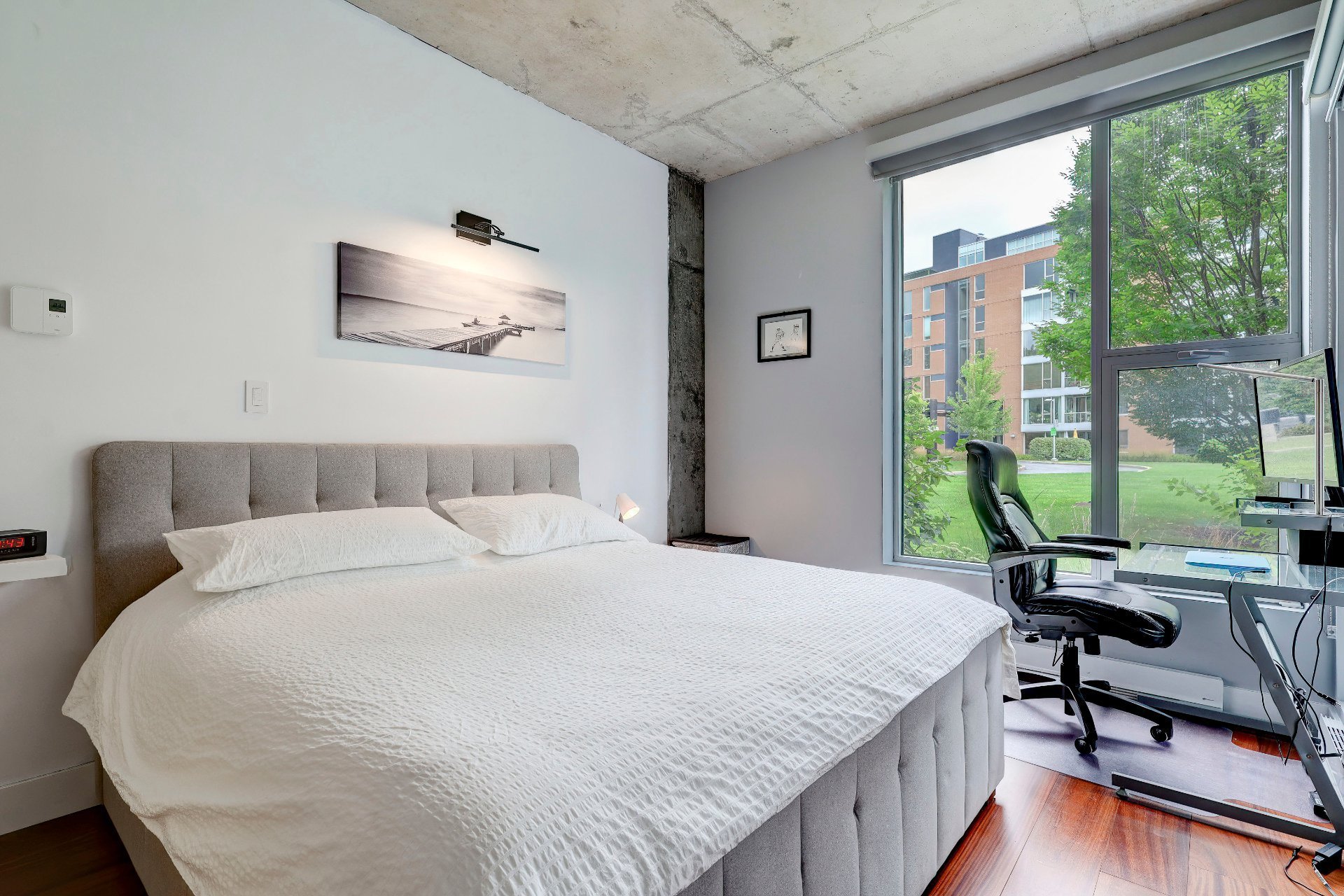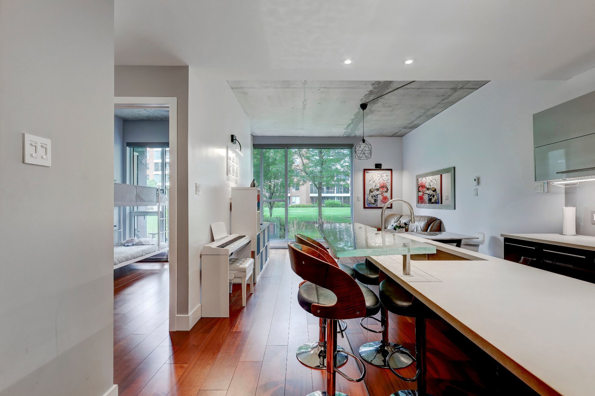 Le salon, la salle à manger et la cuisine sont à aire ouverte. Le plafond de ces pièces (ainsi que des chambres à coucher) est en béton et transforme un espace en lui conférant une allure moderne et sophistiquée, en plus d'avoir une hauteur de 10 pieds. La texture brute et la couleur neutre ajoutent du caractère tout en restant polyvalent. Il est combiné avec des fenêtres pleine hauteur, le contraste entre le béton et la lumière naturelle crée une ambiance à la fois élégante et dynamique. La lumière accentue la texture du béton, soulignant ses nuances et ses imperfections naturelles, tout en adoucissant l'espace avec sa chaleur. Ce mélange de matériaux et de lumière permet de jouer avec les perceptions de l'espace, offrant une esthétique contemporaine qui reste accueillante et vivante. C'est une approche particulièrement efficace dans les espaces ouverts où l'on souhaite équilibrer modernité et confort.