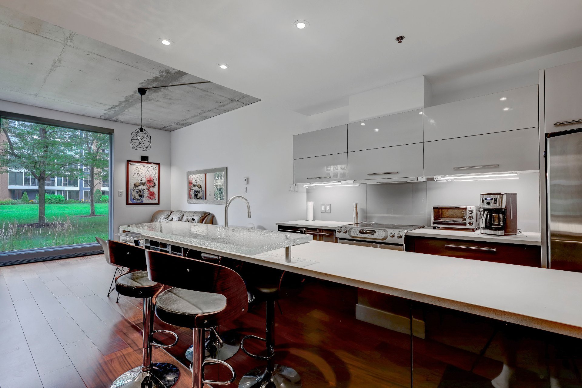 La cuisine contemporaine équipée d'électroménagers en acier inoxydable et d'un comptoir-lunch très stylé en verre, offre non seulement un espace fonctionnel pour cuisiner, mais aussi un lieu convivial pour recevoir.