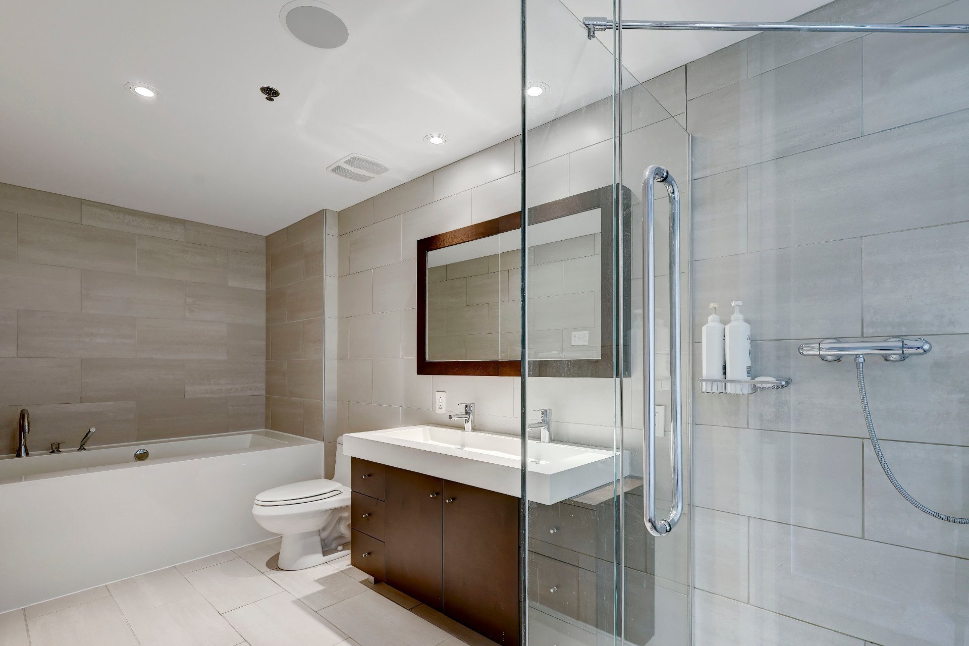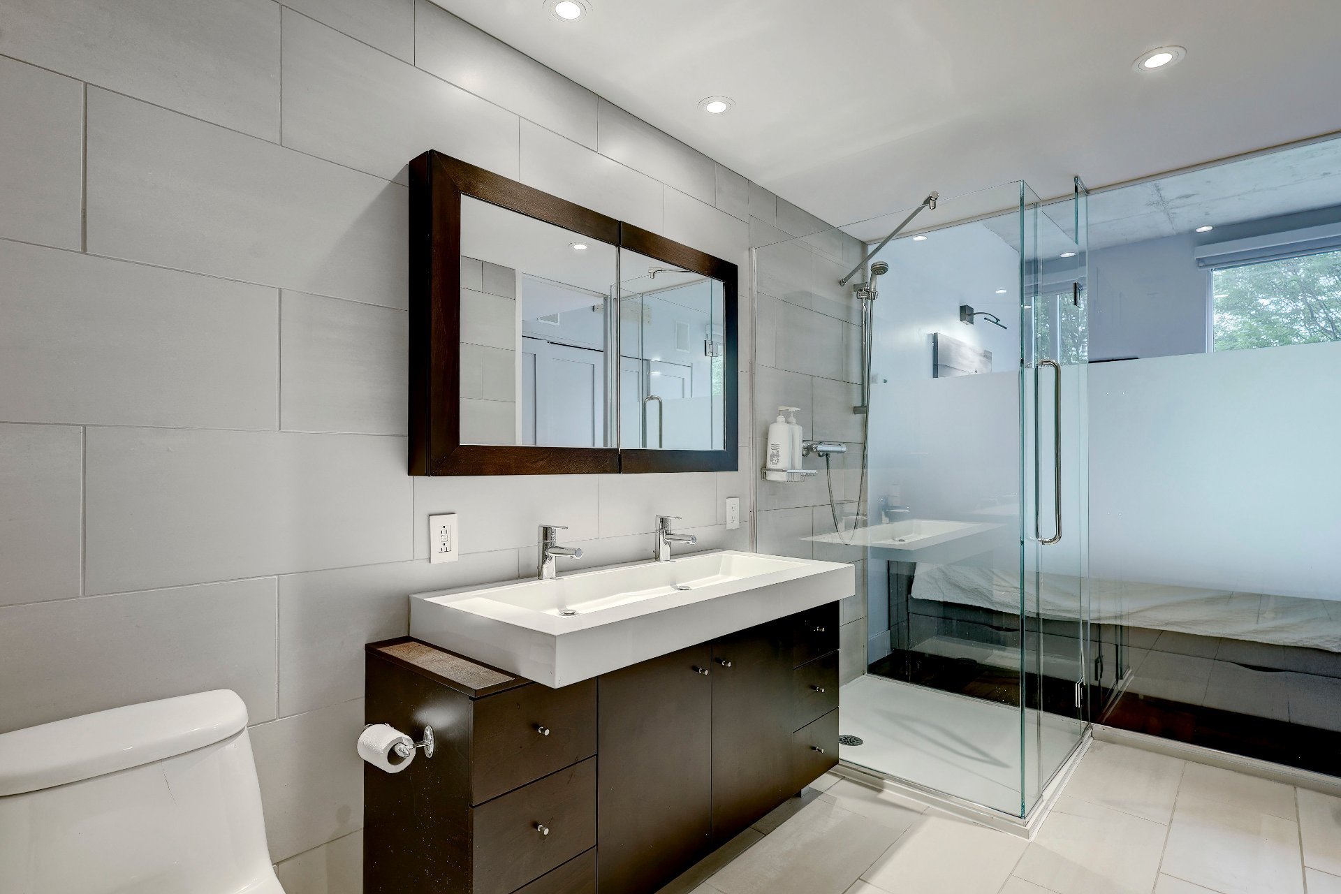 La chambre à coucher principale jouit d'une salle de bain ensuite, ouverte sur la chambre. On y trouve une grande douche de verre, une vanité avec large vasque et une baignoire profonde. La seconde chambre dispose d'une garde-robe organisée et les fenêtres donnent sur la terrasse. Elle jouit également d'une salle de bain attenante avec baignoire.