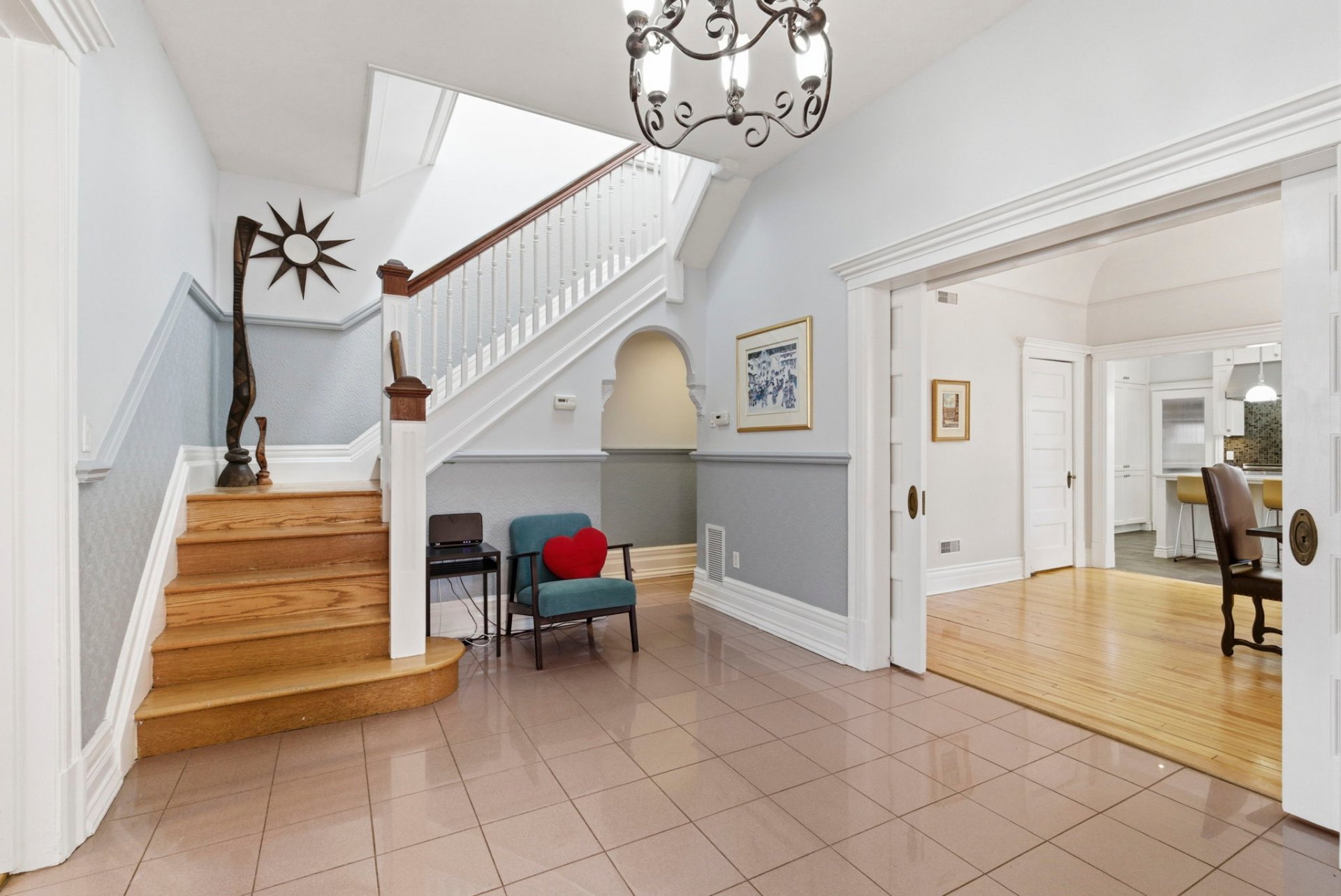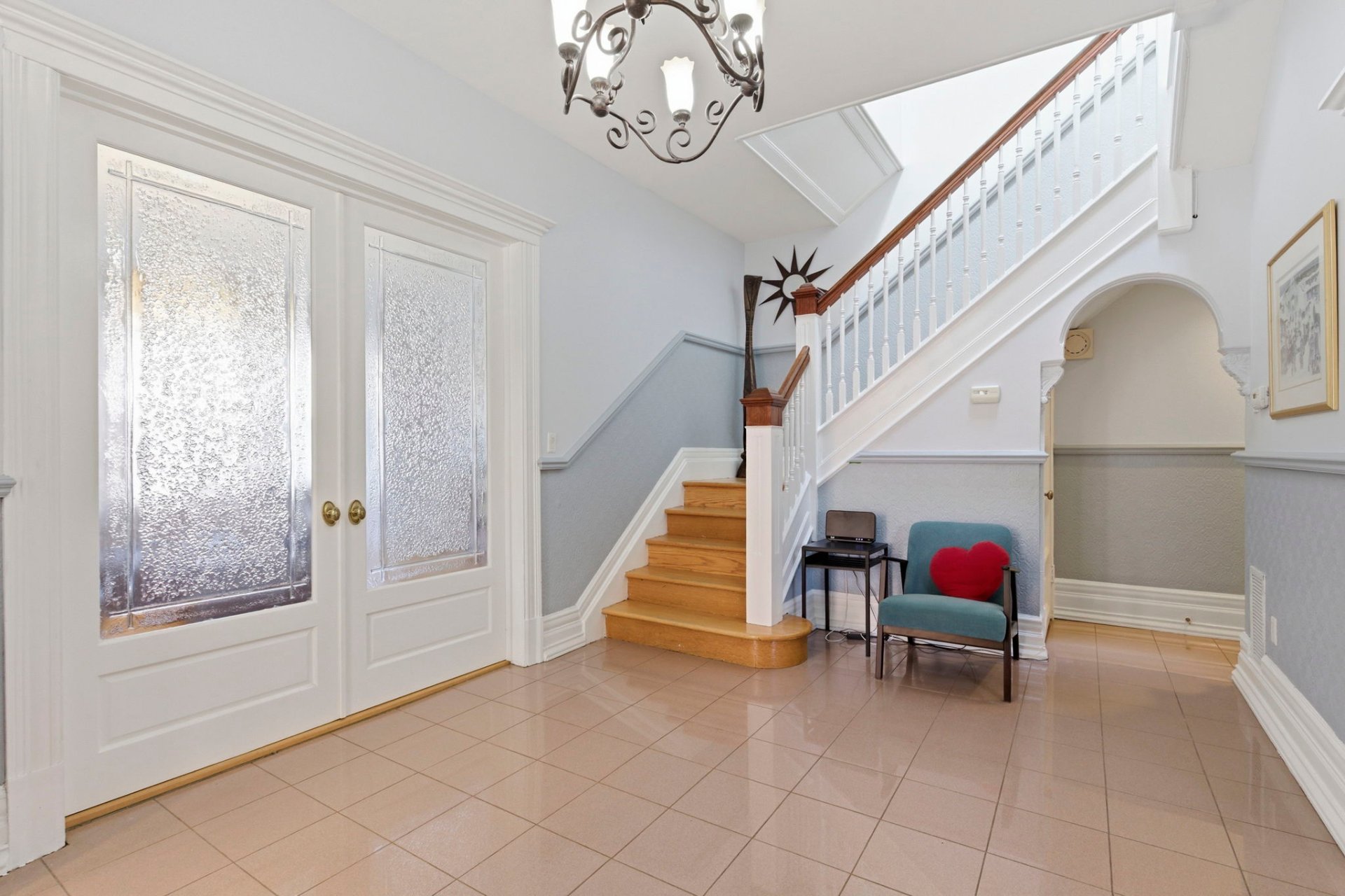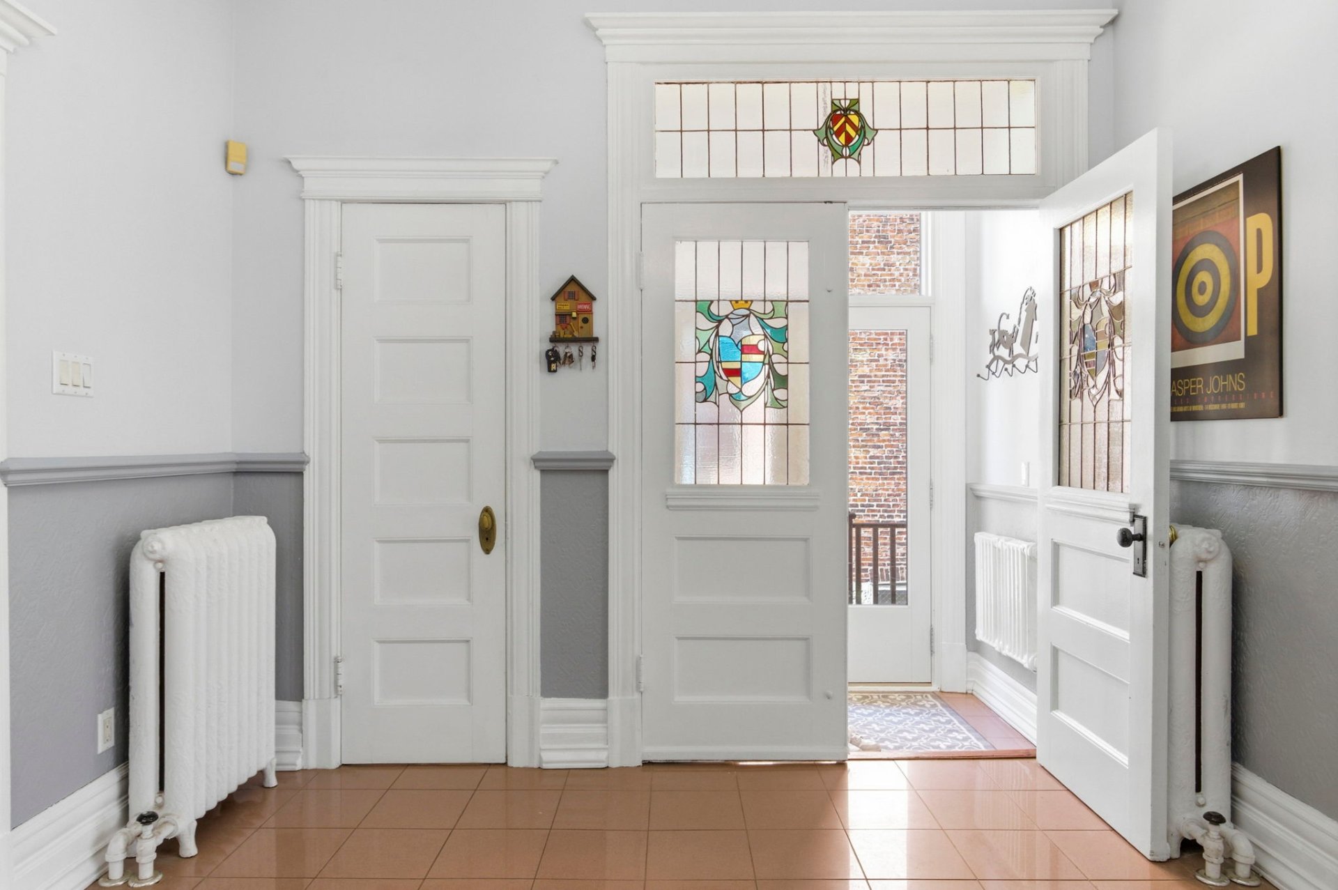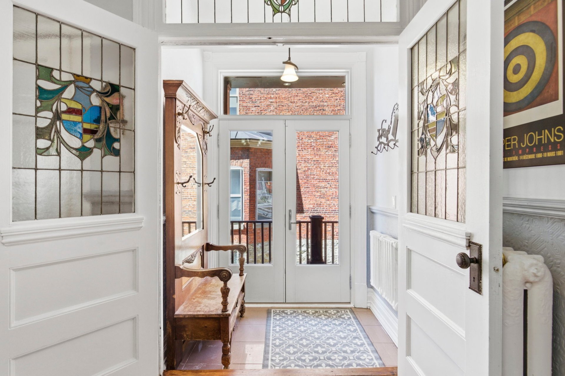 Les détails architecturaux d'époque, tels que les moulures élégantes et les portes anciennes avec vitraux, ont été soigneusement préservés ou restaurés avec respect.