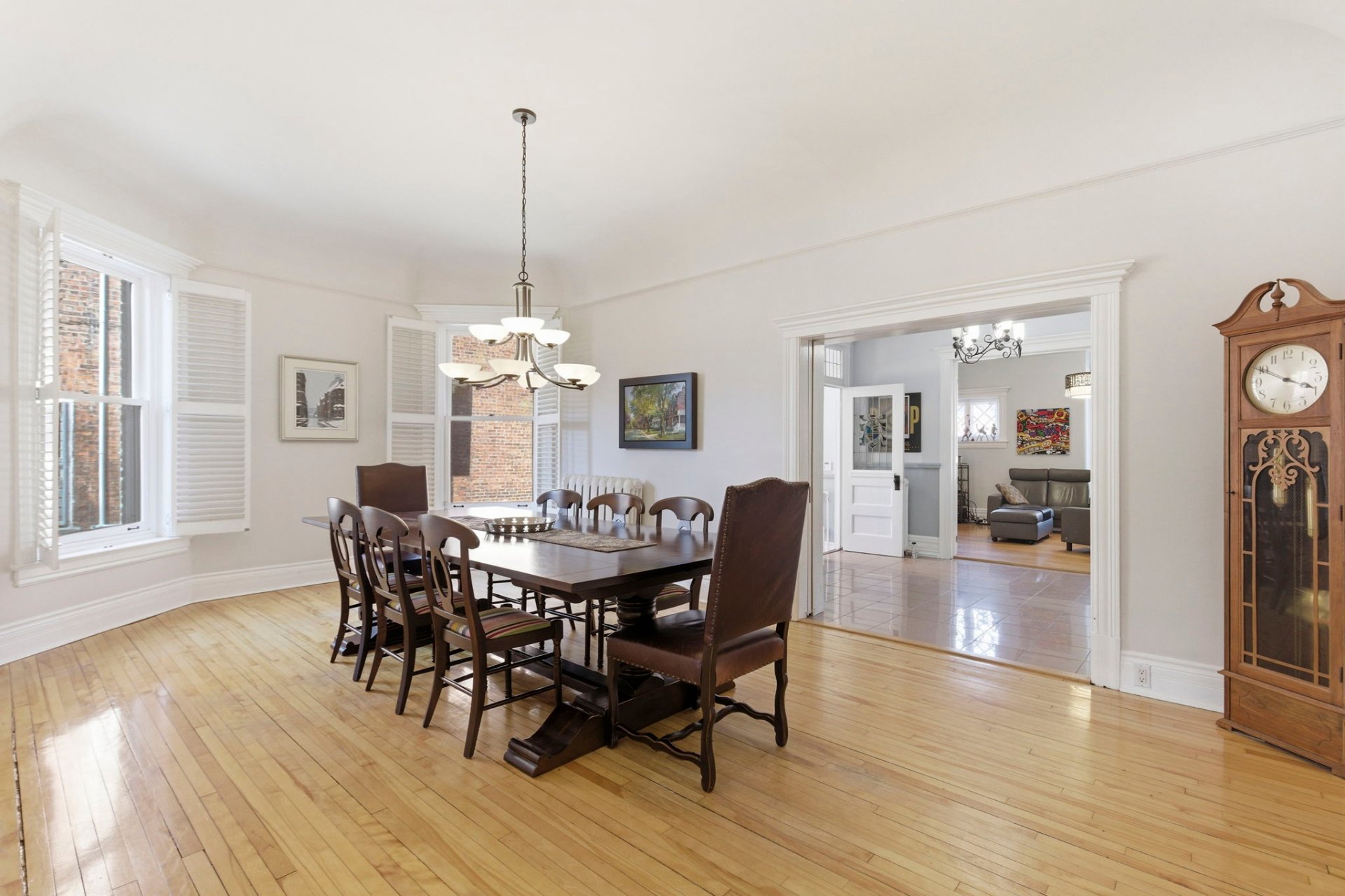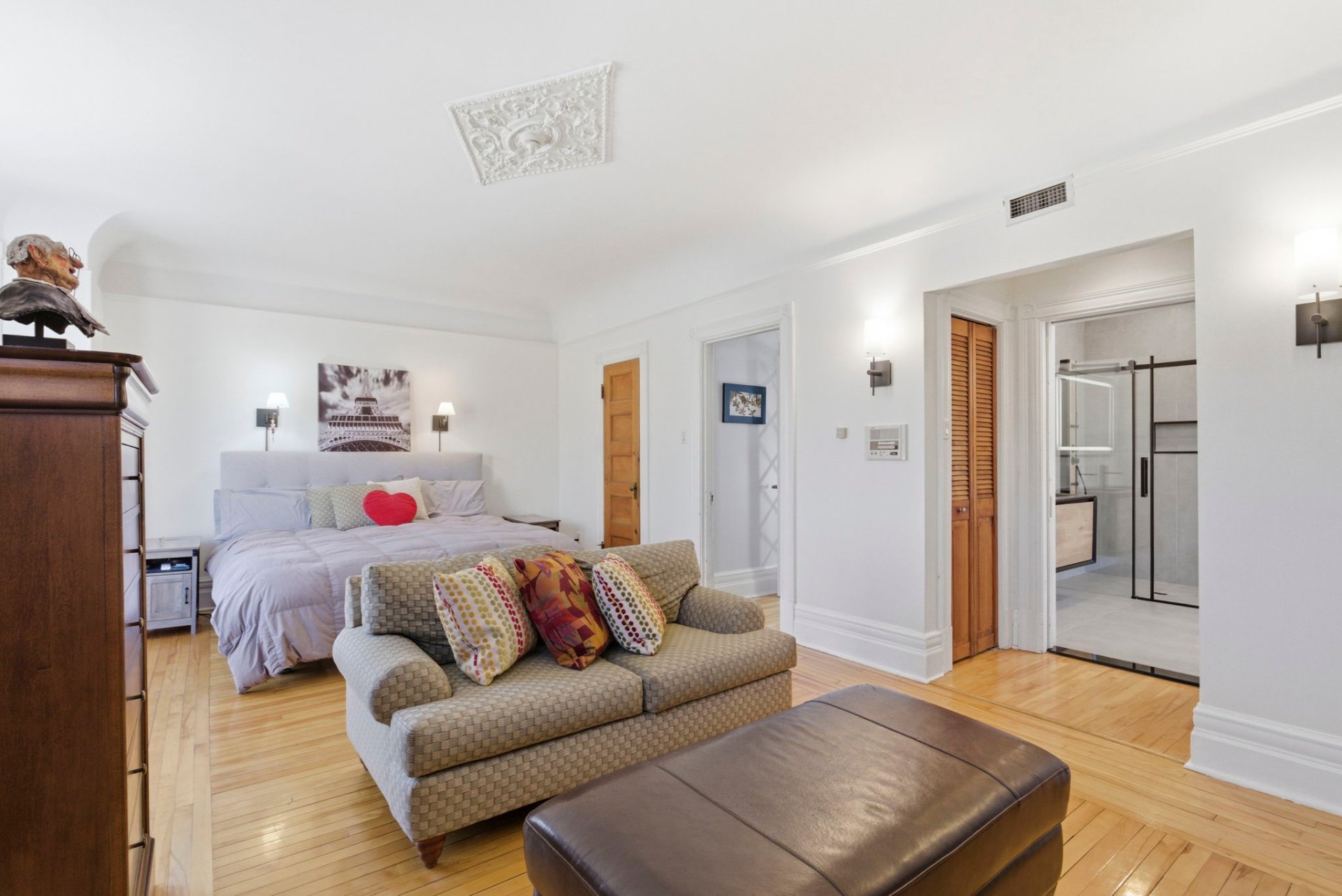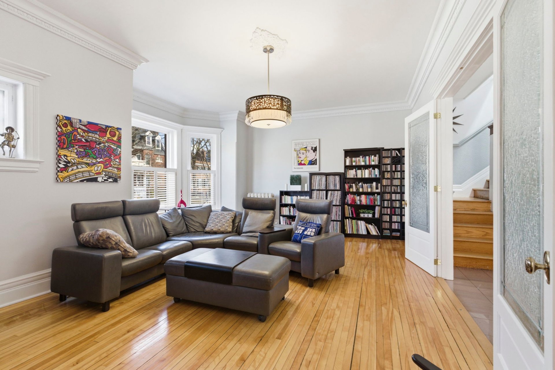 Les détails architecturaux d'époque, tels que les moulures élégantes et les portes anciennes avec vitraux, ont été soigneusement préservés ou restaurés avec respect.