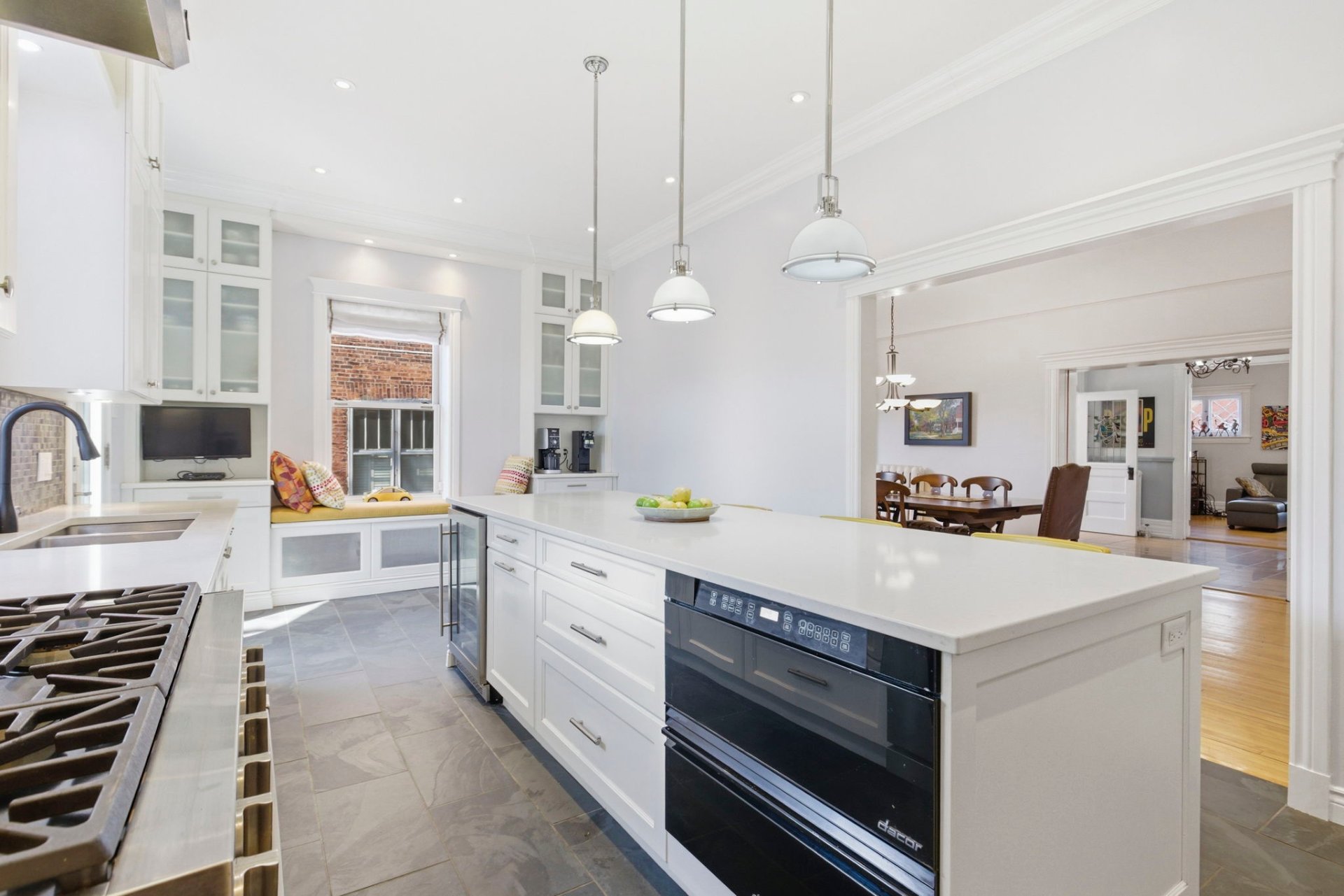 Rez-de-chaussée - Large hall d'entrée s'ouvrant de part et d'autre sur le salon et la salle à manger; - Lumineux salon, l'ancien foyer a été conservé et transformé au gaz; - Salle à manger aux volumes remarquables, adjacente à la cuisine; - Spacieuse cuisine gourmet comprenant un imposant ilot central de 10 pieds, plusieurs armoires, électroménagers haut-de-gamme, (cuisinière au gaz Dacor à 6 brûleurs) et jouissant d'un accès direct au jardin; - Salle de lavage avec rangement et évier, près de la cuisine; - Salle d'eau; - Plafond d'une hauteur de 10 pieds.
