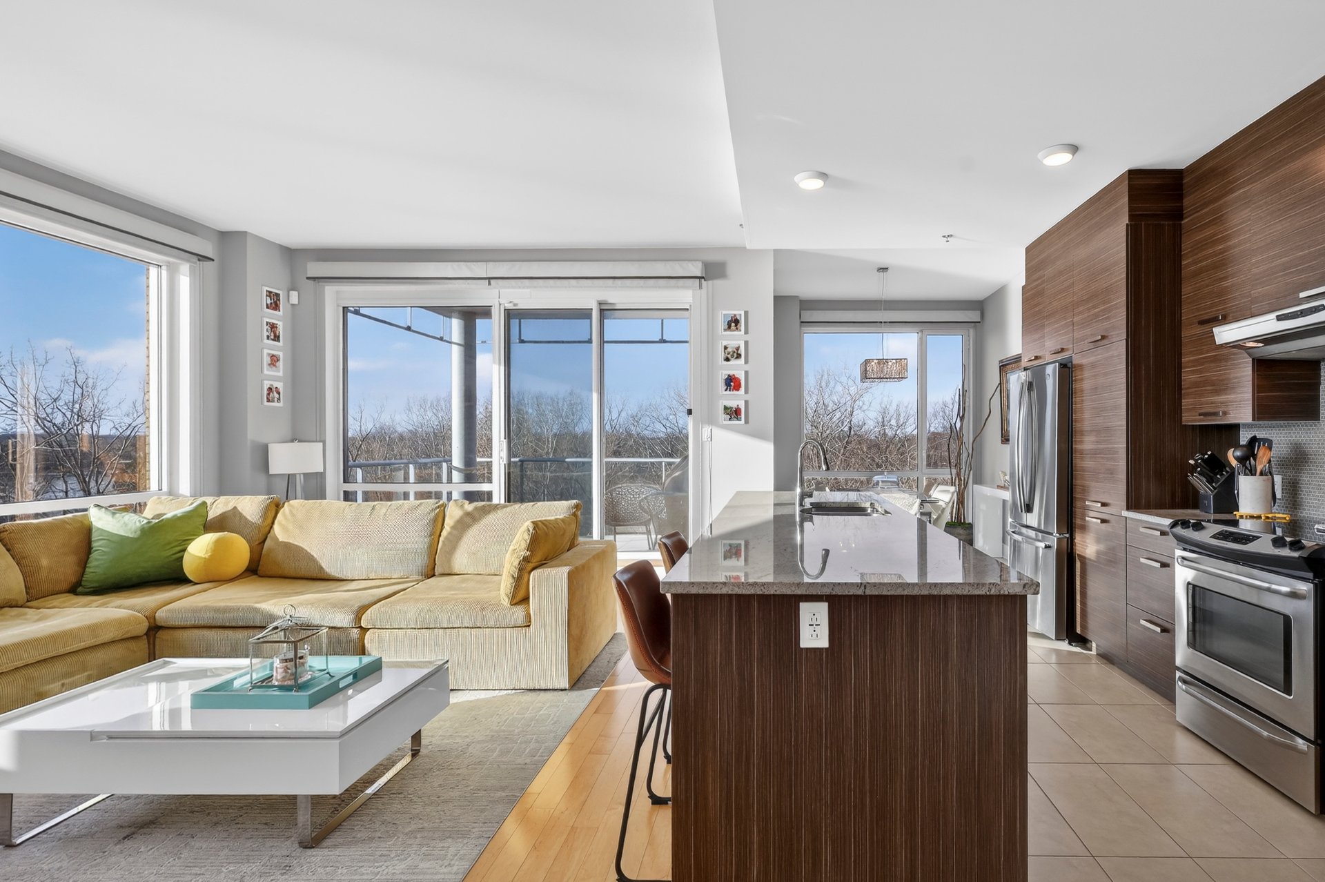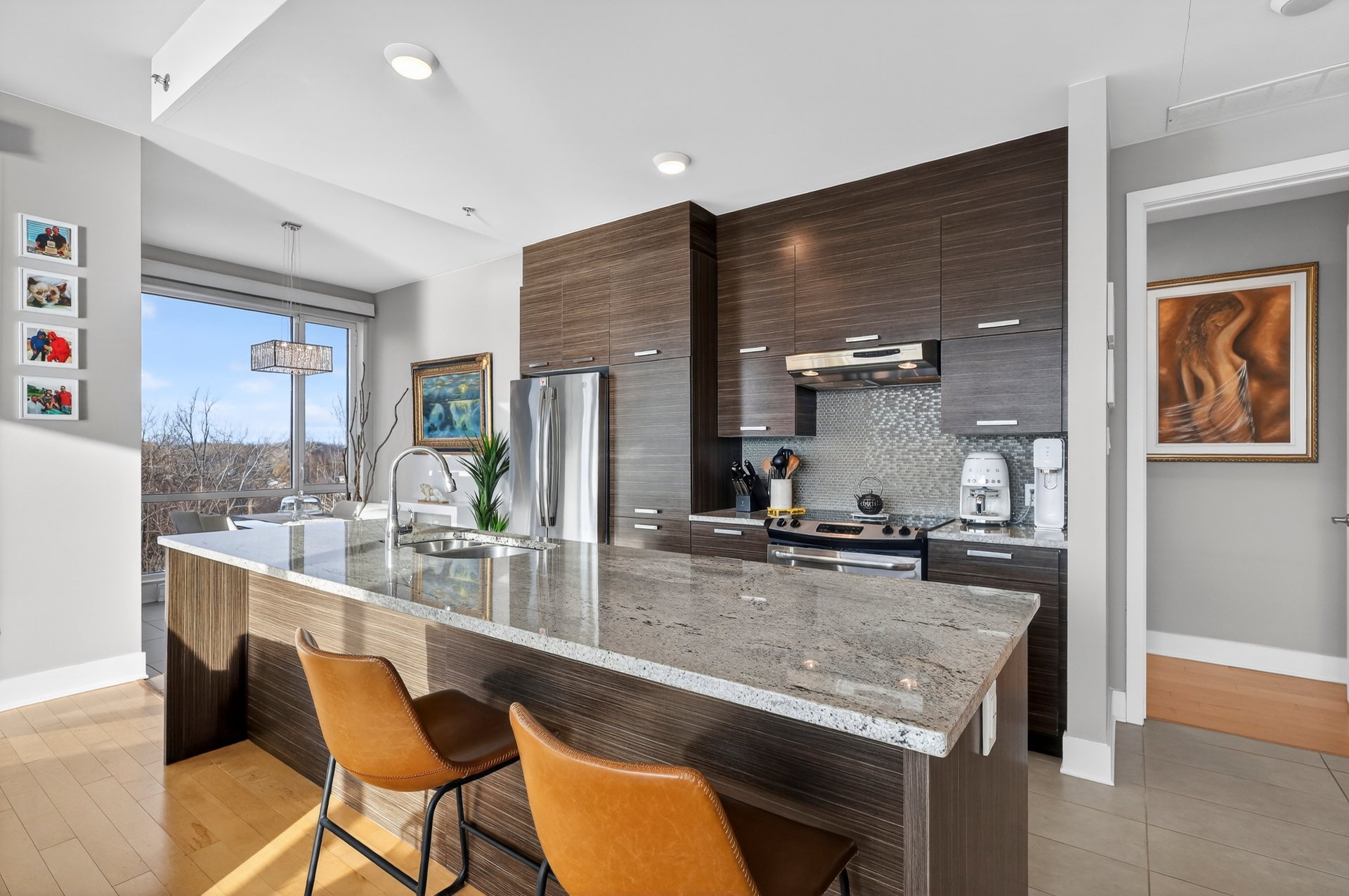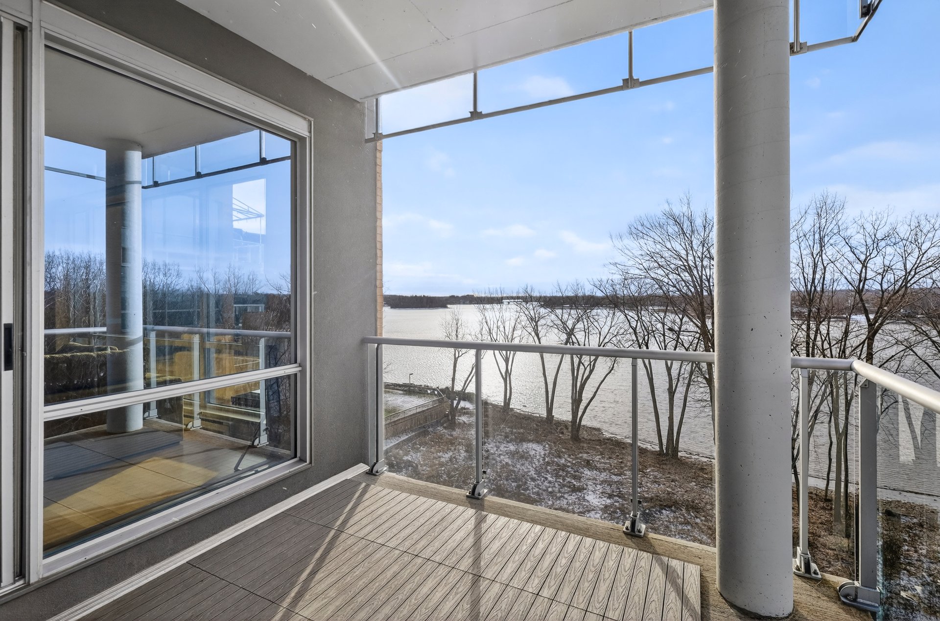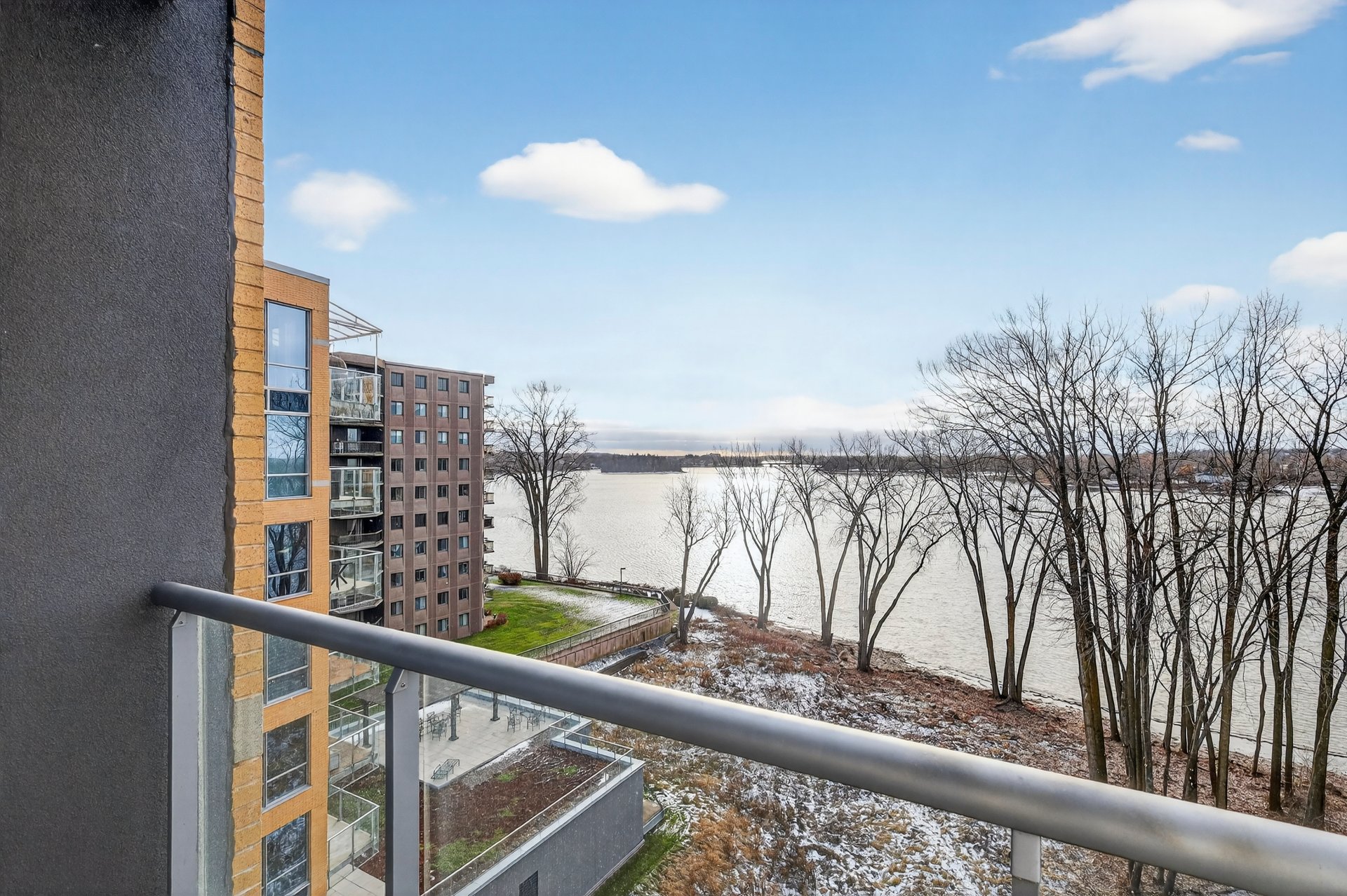 - Hall d'entrée avec garde-robe - Salon, salle à manger et cuisine de concept à aire ouverte - Fenêtres du sol au plafond (plafond de 10') - Cuisine avec armoires teinte bois foncé, comptoir lunch de granit - Suite des maîtres élégante; salle de bain ensuite avec douche imposante - Seconde chambre à coucher ici utilisée comme bureau - Autre salle de bain attenante comprenant une baignoire avec douche téléphone; les laveuse/sécheuse y sont installées dans un placard -Terrasse face à la rivière
