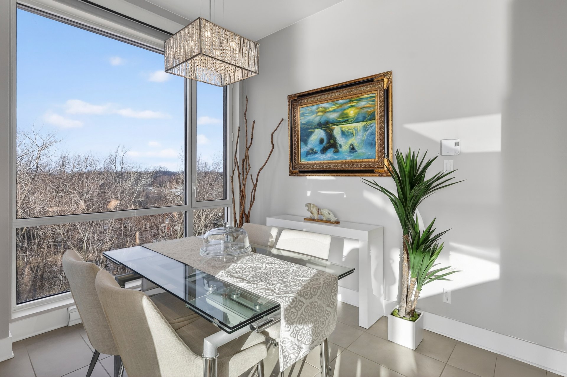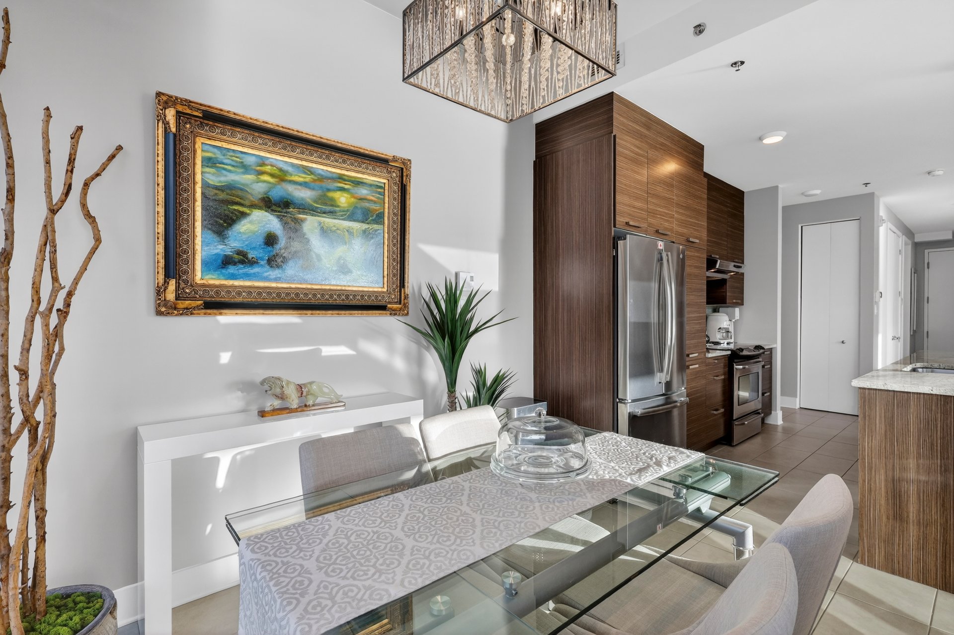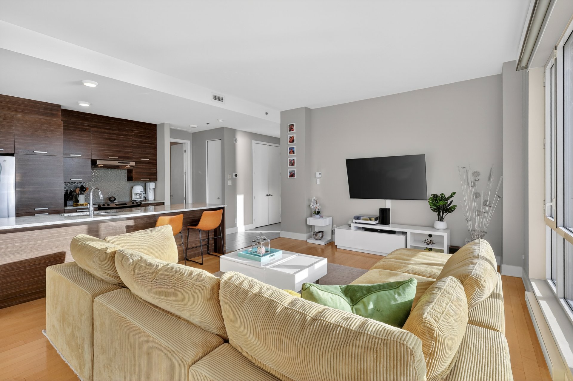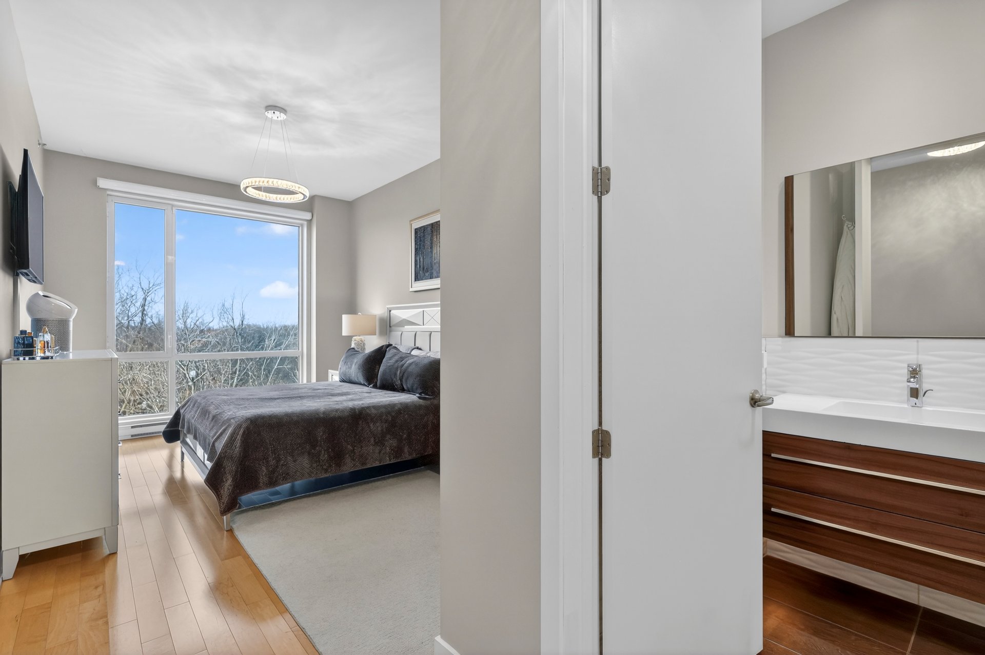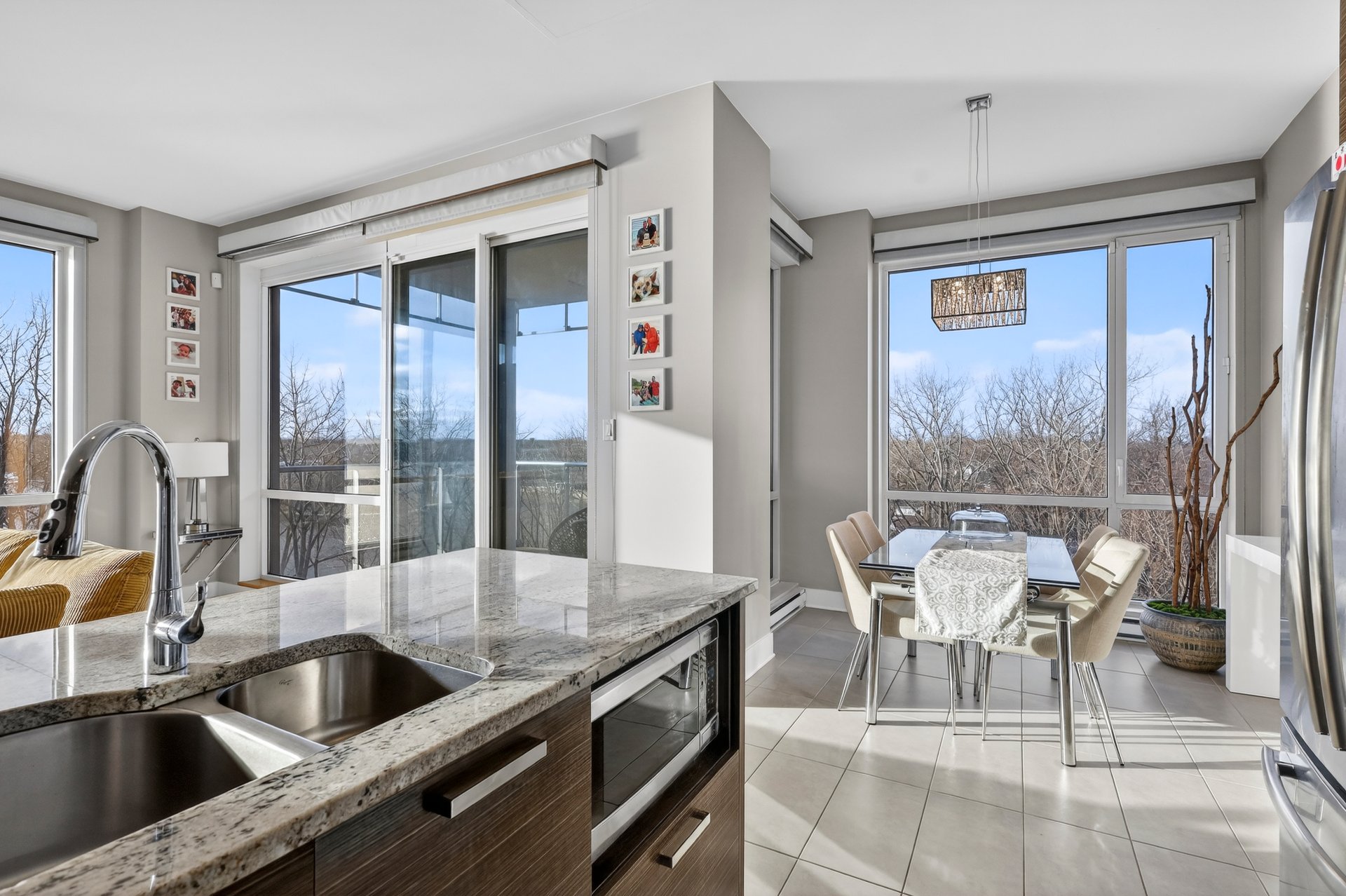 - Hall d'entrée avec garde-robe - Salon, salle à manger et cuisine de concept à aire ouverte - Fenêtres du sol au plafond (plafond de 10') - Cuisine avec armoires teinte bois foncé, comptoir lunch de granit - Suite des maîtres élégante; salle de bain ensuite avec douche imposante - Seconde chambre à coucher ici utilisée comme bureau - Autre salle de bain attenante comprenant une baignoire avec douche téléphone; les laveuse/sécheuse y sont installées dans un placard -Terrasse face à la rivière