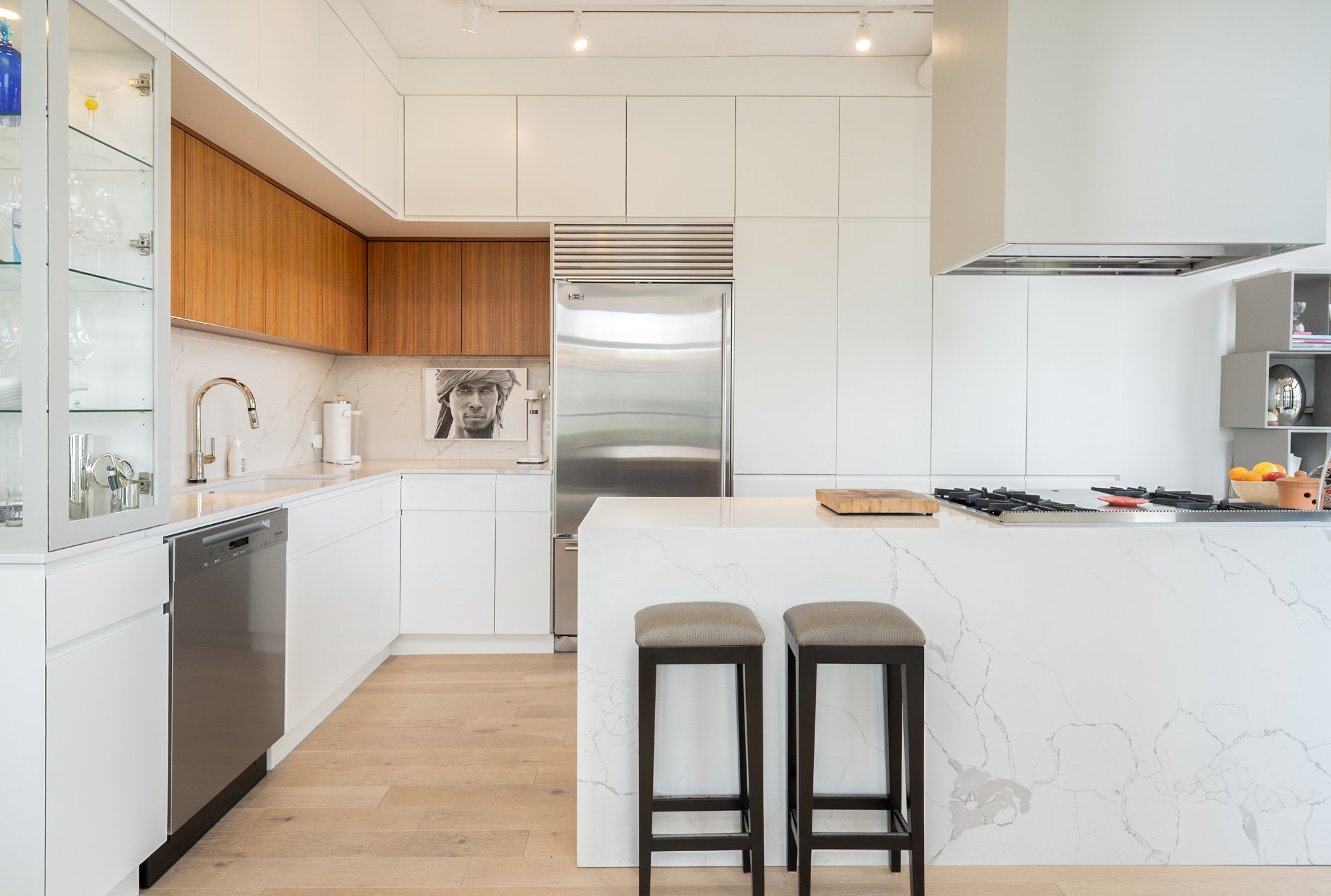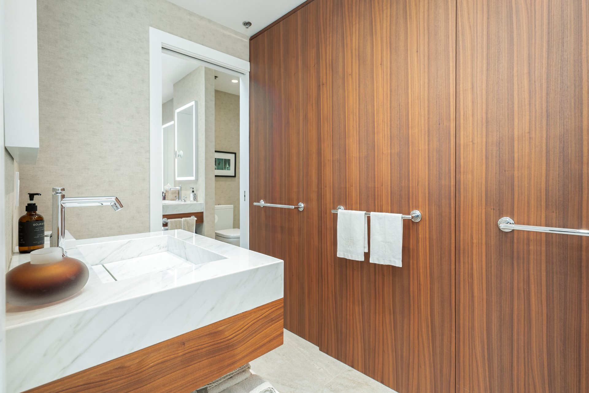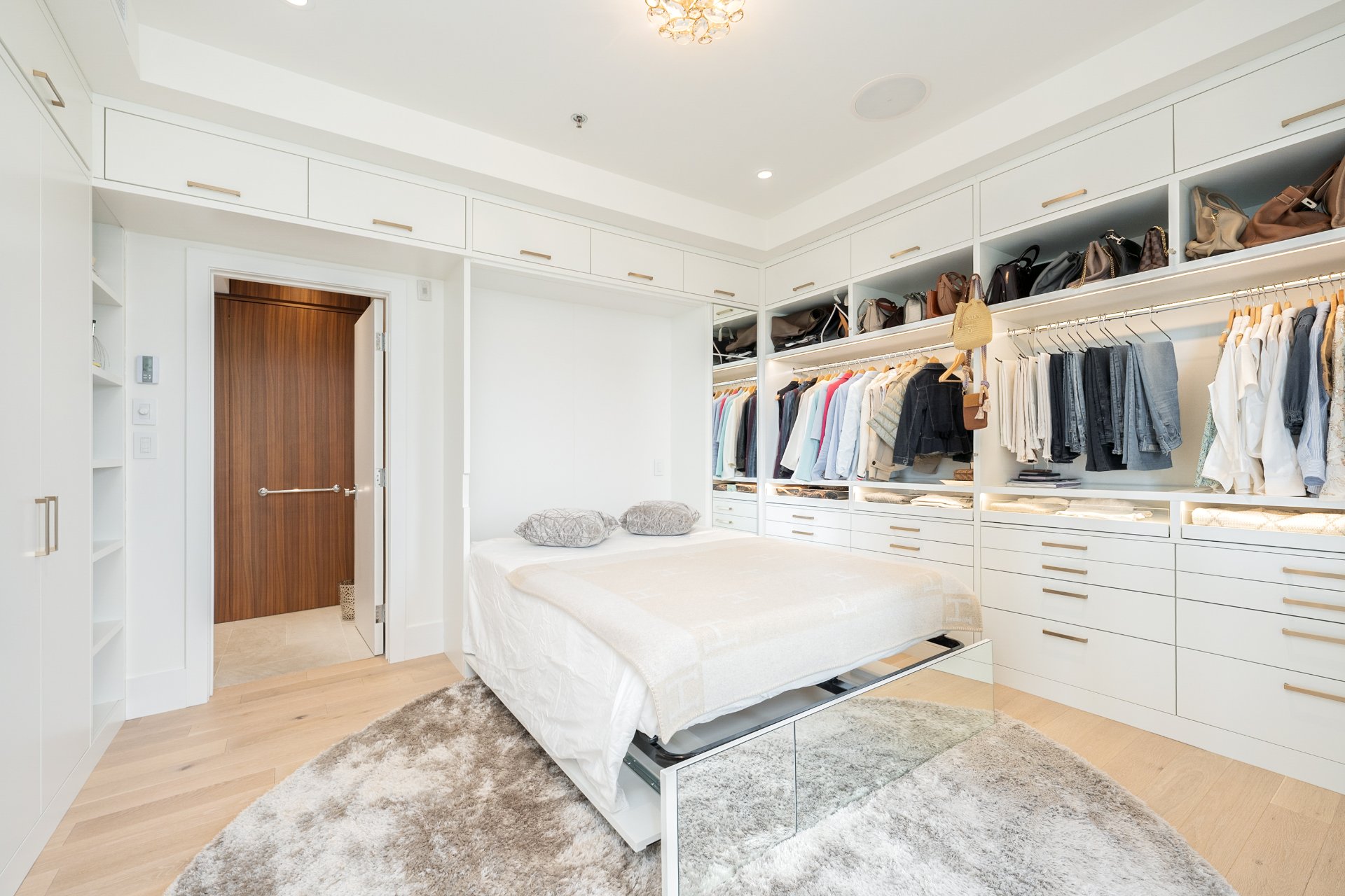 À l'origine conçu avec deux chambres, le condo a été modifié pour offrir une chambre principale de belle dimension, accompagnée d'un walk-in généreux aménagé dans la deuxième chambre. Par contre, la pièce se transforme facilement grâce à un lit escamotable dissimulé dans le mobilier.
