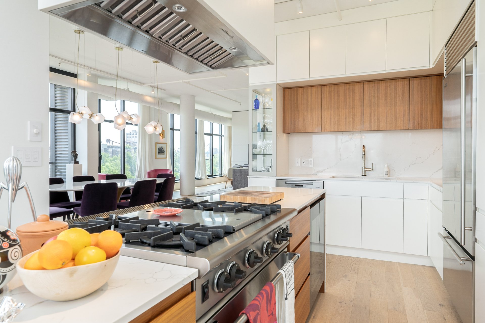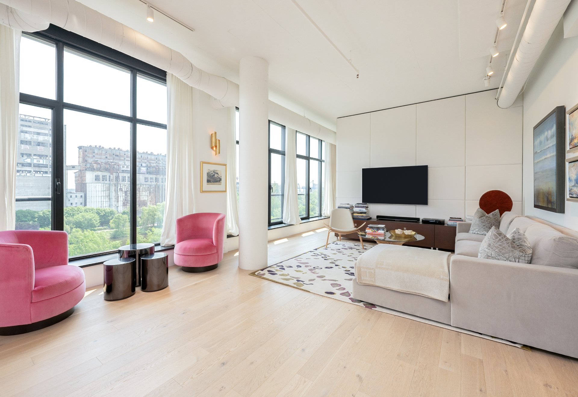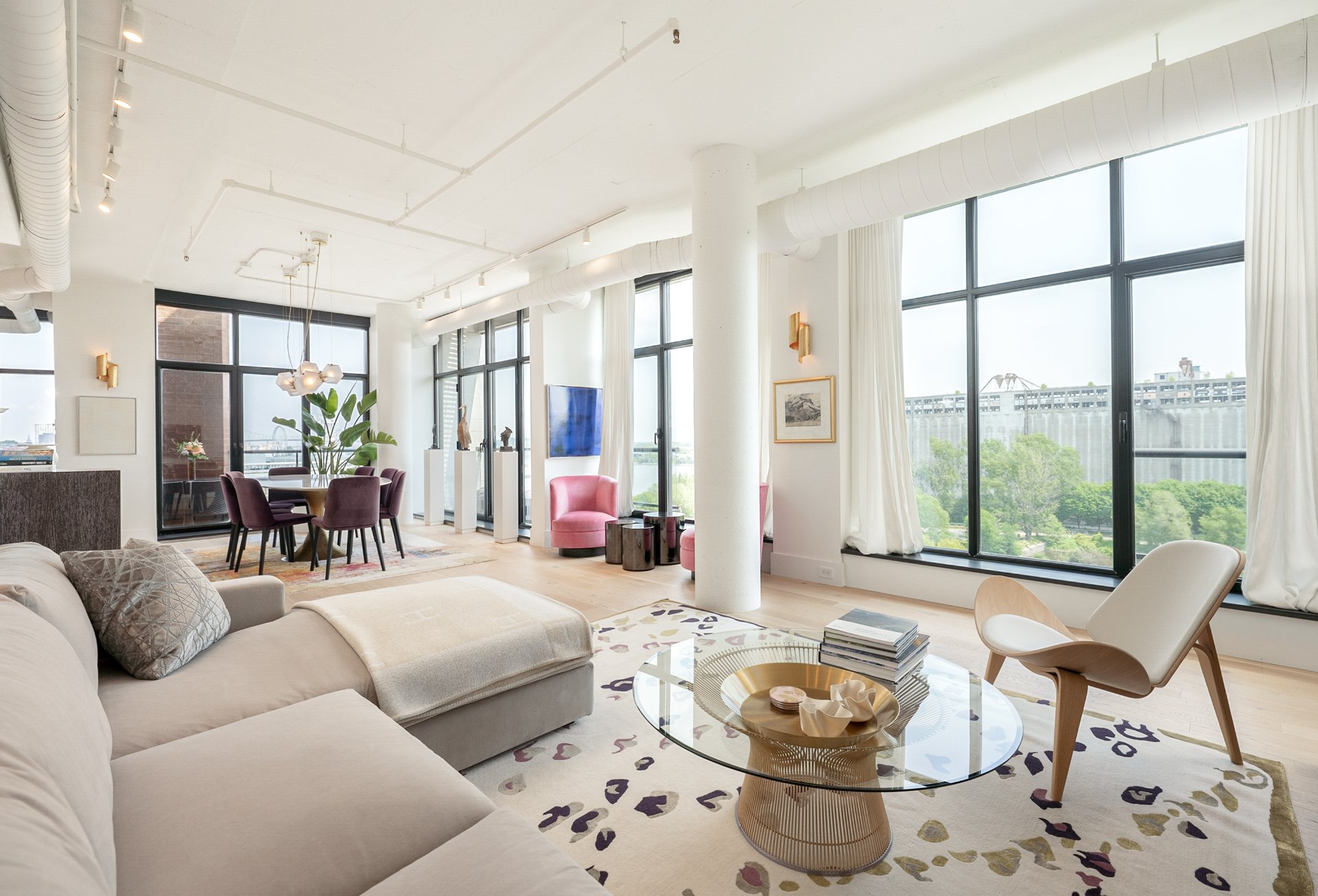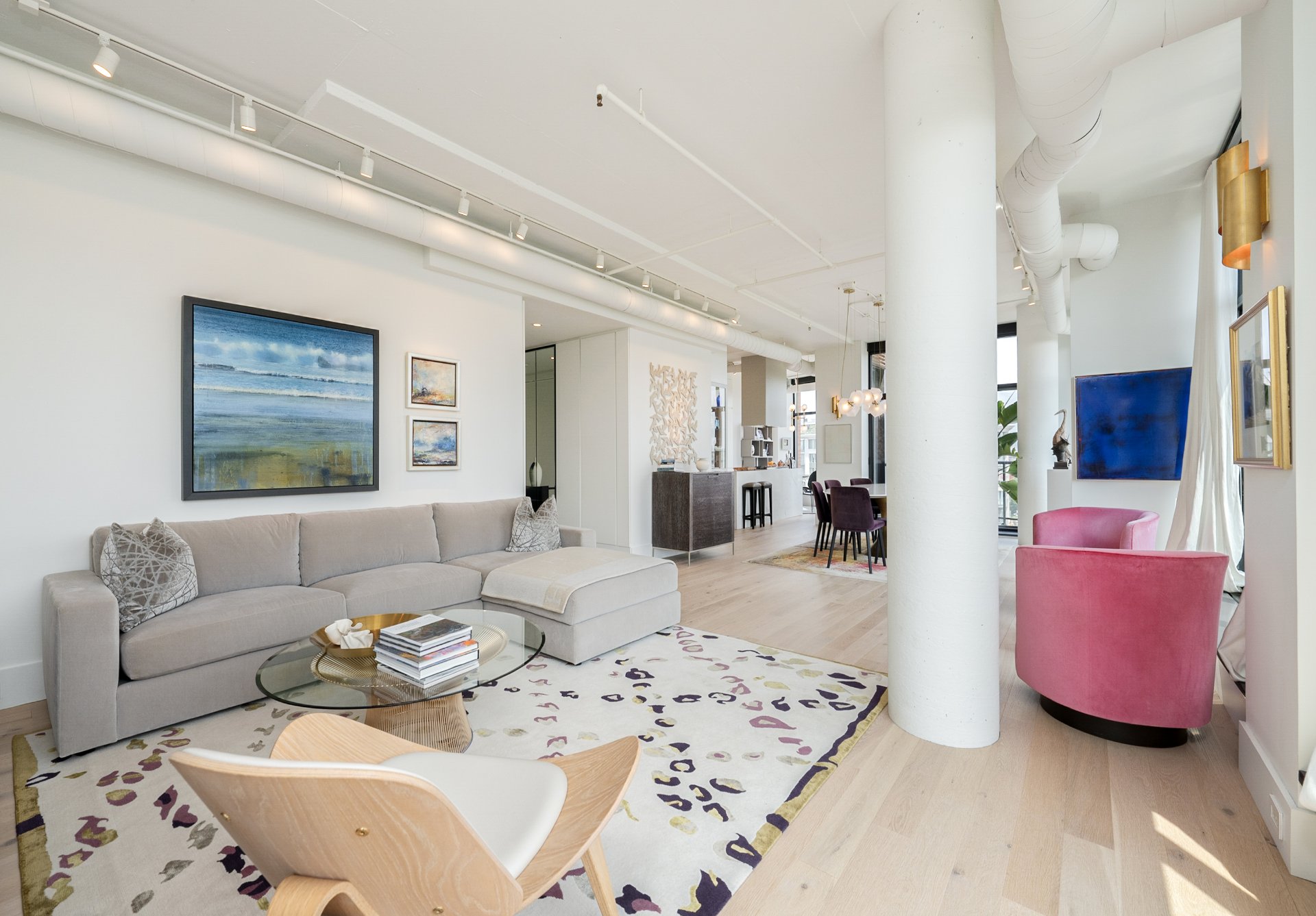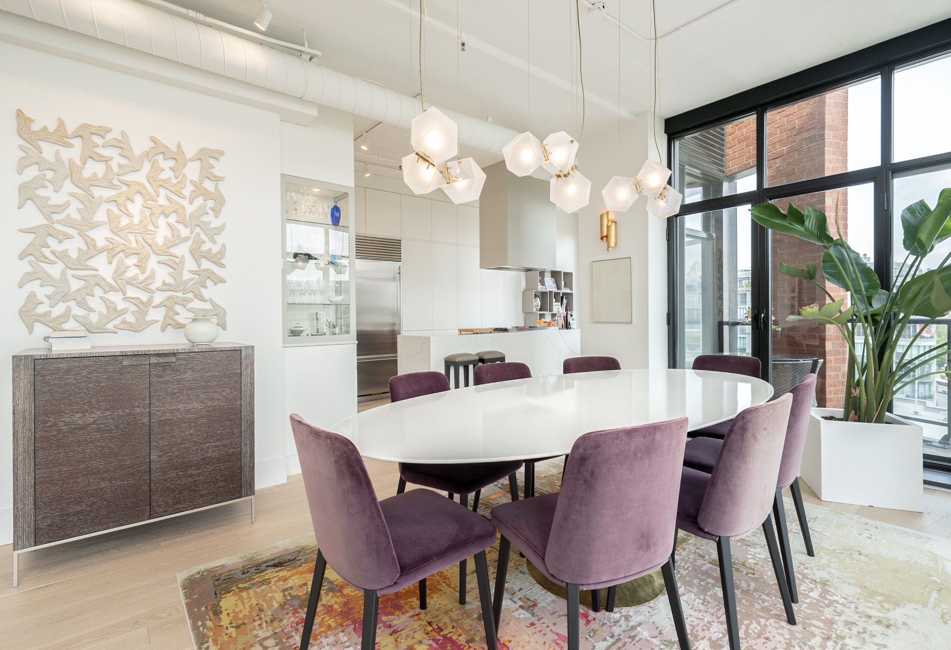 Avec ses plafonds de 10 pieds et ses colonnes de béton apparentes, l'intérieur allie parfaitement caractère industriel et élégance moderne. La vaste pièce à aire ouverte regroupe le salon et la salle à manger dans un espace fluide et accueillant.