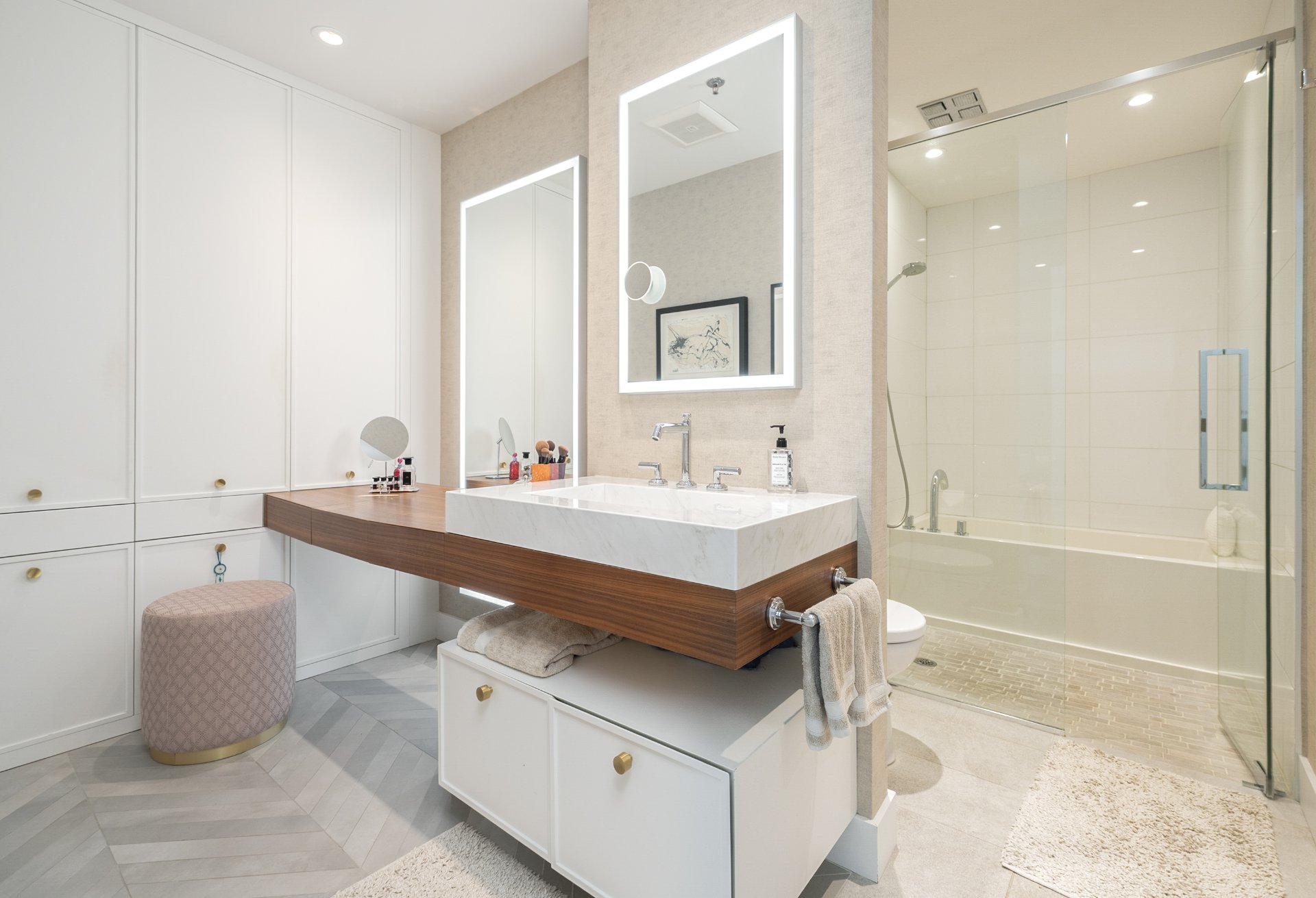 La salle de bain, accessible depuis la chambre et la salle d'eau, comprend une vanité avec maquilleuse intégrée et nombreux placards, baignoire et douche séparée. La salle d'eau attenante abrite les laveuse et sécheuse dissimulées dans des armoires, pour une intégration élégante et pratique.