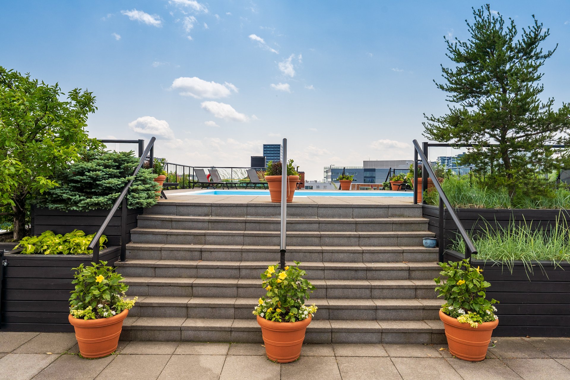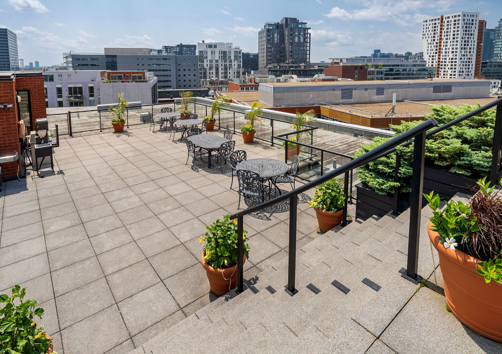 Une terrasse commune sur le toit comprend une piscine chauffée, et la vue sur la ville est réellement à couper le souffle.
