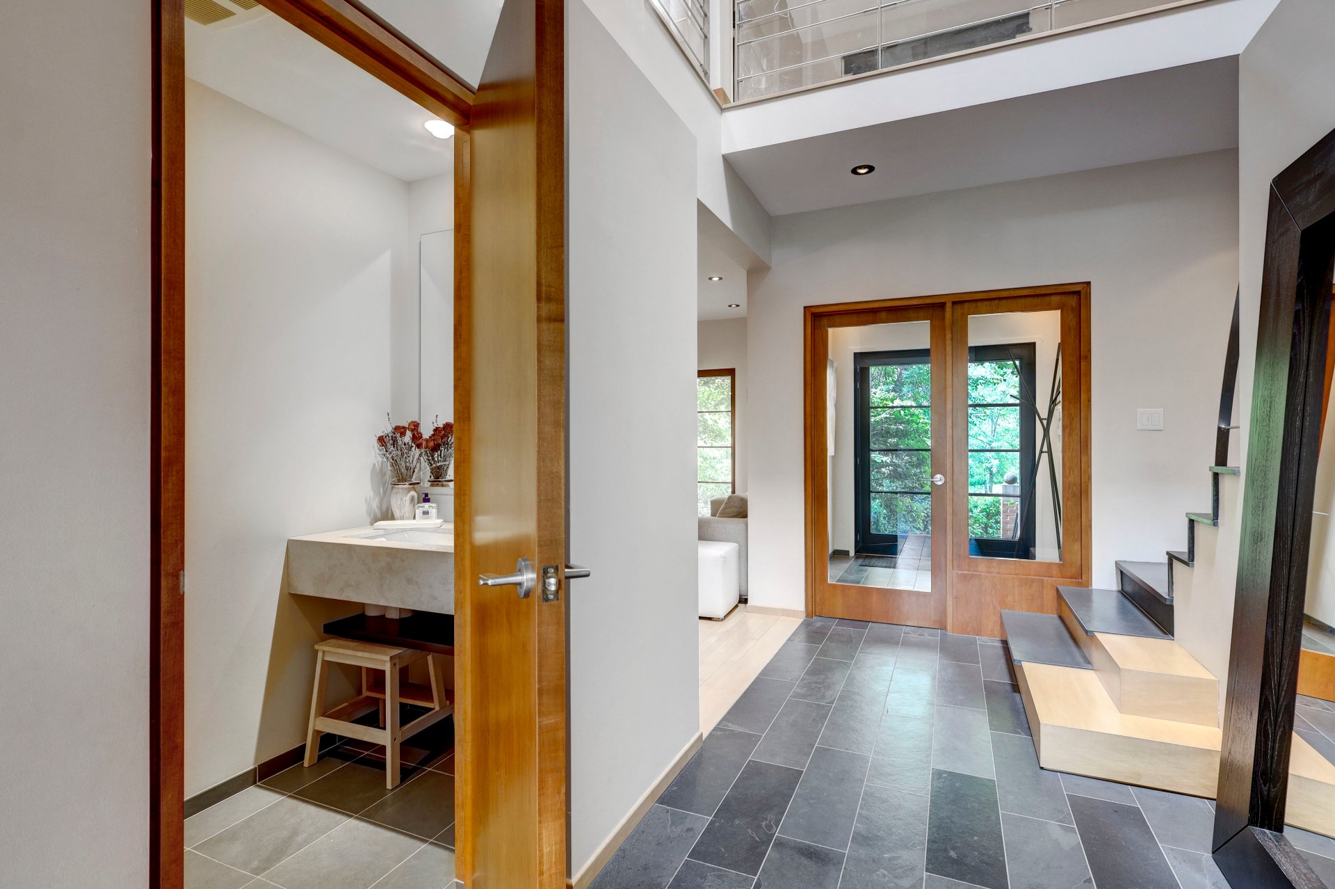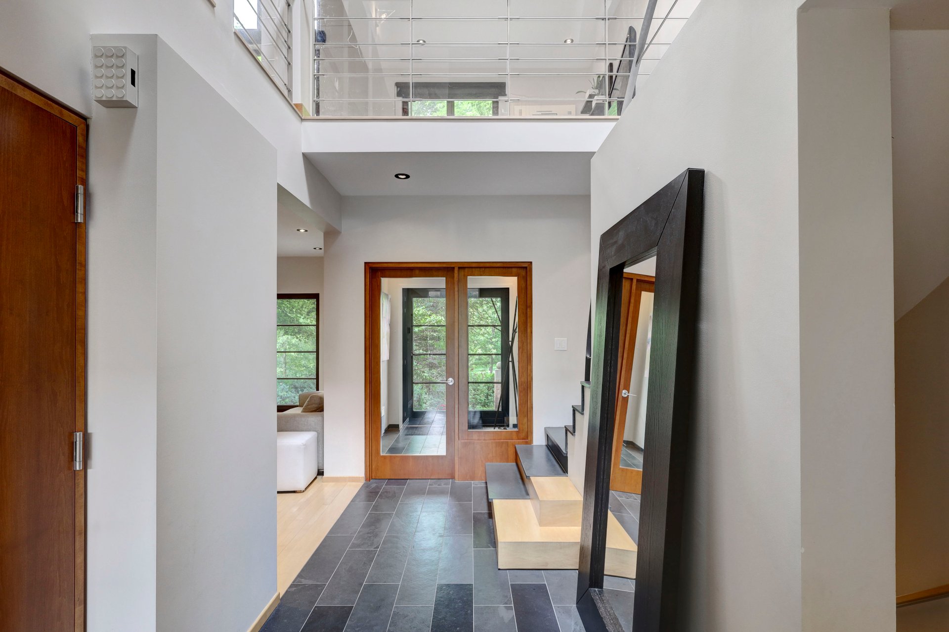 Un élégant escalier en ardoise, avec garde-corps en métal,